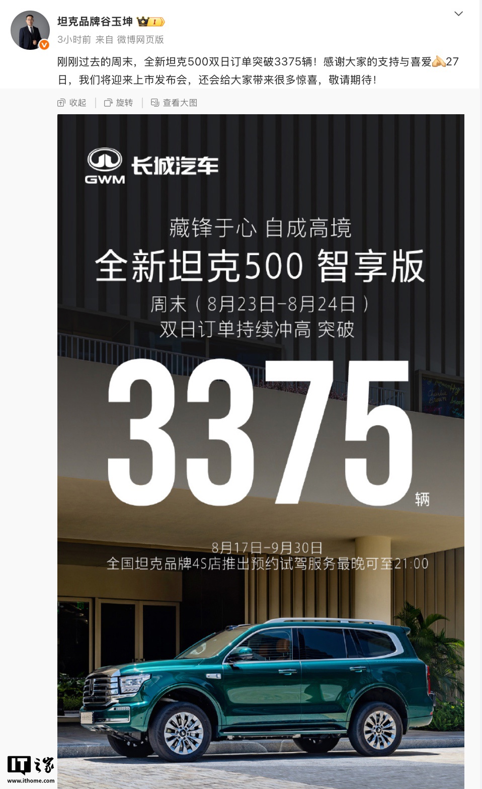 8 月 25 日消息,长城汽车旗下坦克品牌执行副总经理谷玉坤发文,透露在刚刚过去的周末(注:指 8 月 23 日及 24 日),全新坦克 500 车型“双日订单”突破 3375 辆。该车将于 8 月 27 日上市,预售价 36 万元起。