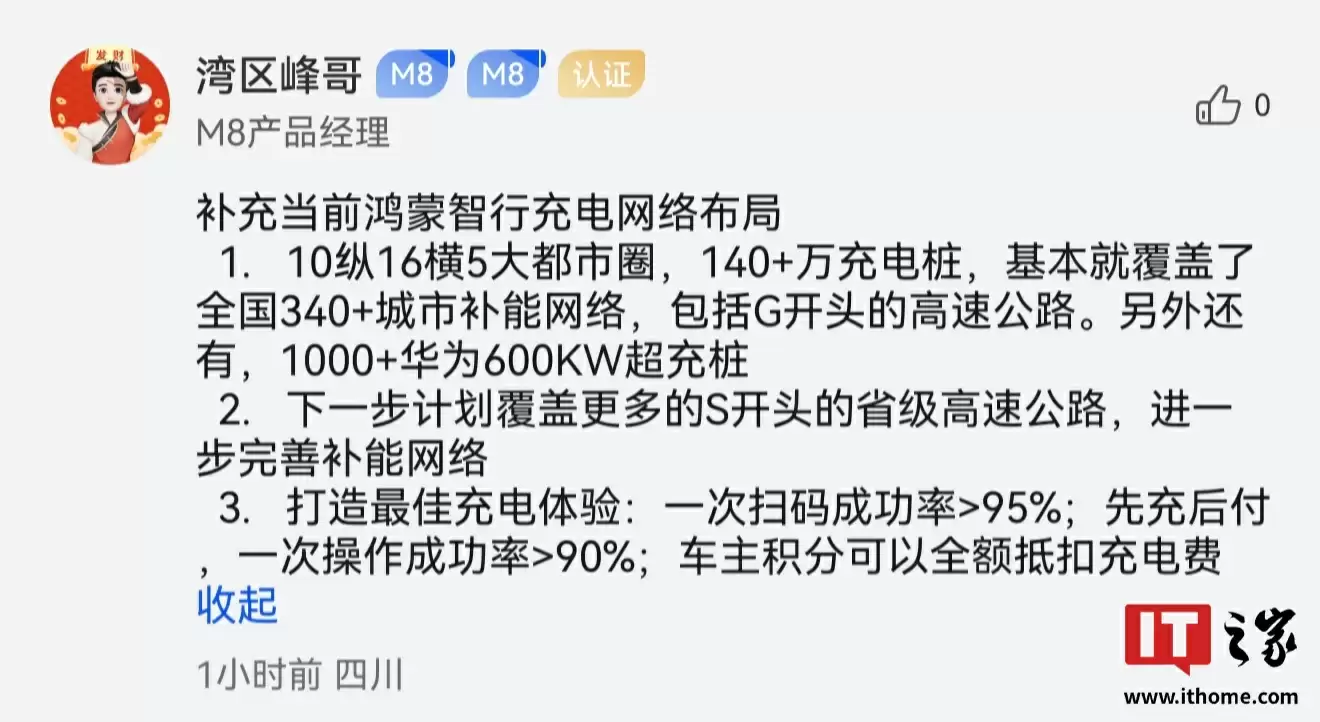 据此前报道,鸿蒙智行充电网络覆盖 10 纵 16 横 5 大都市圈,接入 140+ 万充电桩,基本覆盖全国 340+ 城市补能网络,包括 G 开头的高速公路。鸿蒙智行还接入了 1000+ 华为 600KW 超充桩,下一步计划覆盖更多的 S 开头的省级高速公路,进一步完善补能网络。