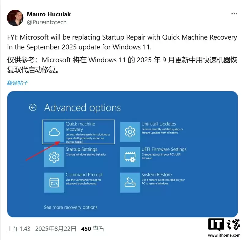 8 月 25 日消息,科技媒体 borncity 昨日(8 月 24 日)发布博文,报道称微软计划在下月(2025 年 9 月)发布的累积更新中,调整 Windows 11 系统中的恢复环境(WinRE),用“快速计算机恢复”(Quick Machine Recovery,QMR)替换现有“启动修复”(Startup Repair)功能。