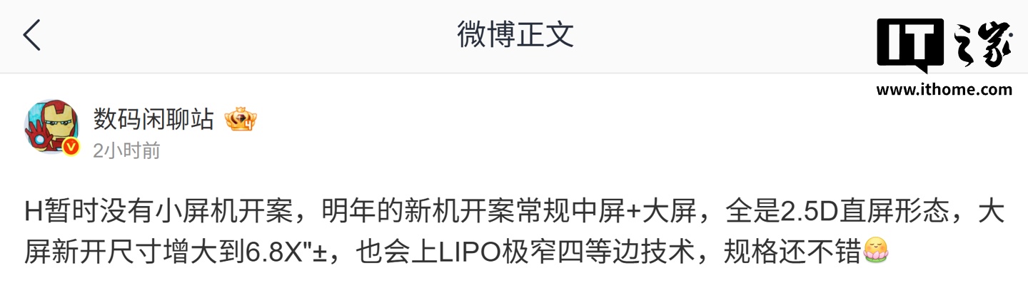 8 月 25 日消息,博主 @数码闲聊站 今天在微博透露,某 H 厂暂时没有小屏手机开案。
