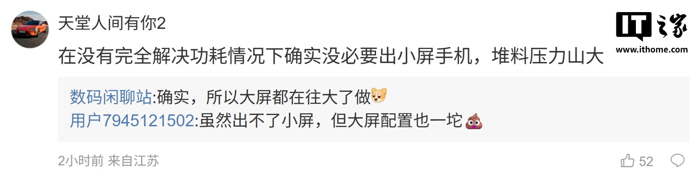 后续有用户在评论区表示:“在没有完全解决功耗情况下确实没必要出小屏手机,堆料压力山大”,博主回复道:“确实,所以大屏都在往大了做