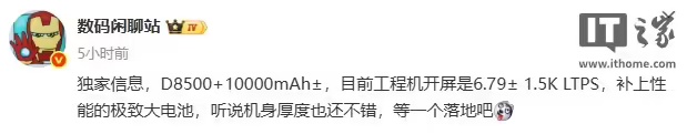 值得注意的是,博主曾在上周透露,某厂的天玑 8500 新机将配备 10000mAh± 电池,目前工程机开屏是 6.79± 英寸 1.5K LTPS,配备兼顾性能的超大电池,排期在明年上半年,预计为荣耀旗下机型。