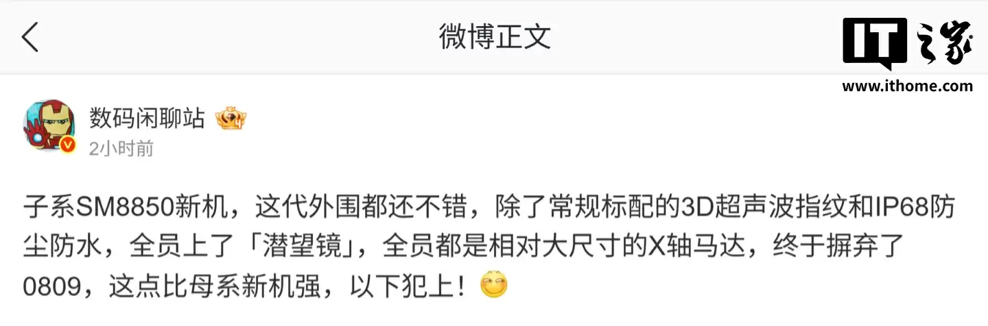 8月25日最新消息,知名博主@数码闲聊站在微博披露,某手机厂商子品牌即将推出的SM8850系列新品将搭载3D超声波屏幕指纹识别和IP68级防水防尘功能。