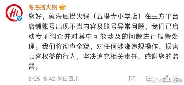 8月25日消息,就媒体报道的“女子点外卖想换配菜被开黄腔辱骂”一事,海底捞回应称,就海底捞火锅(五塔寺小学店)在三方平台店铺账号出现不当内容及账号异常问题,我们已启动专项调查并对其中可能涉及的问题进行报警处理。