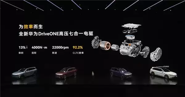 M8 EV首发的全新华为DriveONE高压七合一电驱体积减小13%,转速22000转,峰值扭矩4000牛米,CLTC效率达到92.2%。