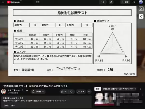 例如以镇定通关恐怖游戏著称的日本主播ガッチマン,在本作测试中取得了280分(满分300)的优异成绩。