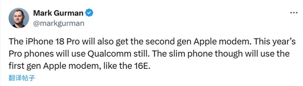 8月25日消息,知名爆料人Mark Gurman在社交平台上表示,iPhone 18 Pro将首发苹果第二代自研基带C2,今年的17 Pro仍然使用高通基带。