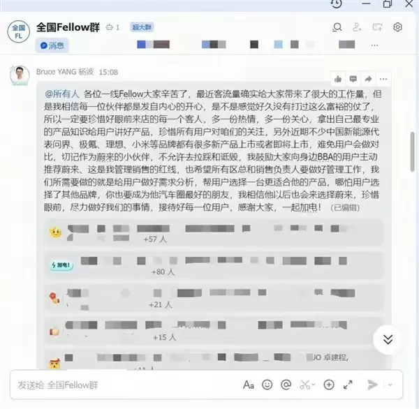 近日,蔚来销售负责人通过内部邮件强调: