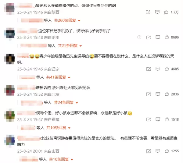 网友评论:鲁迅先生有诸多值得传承的精神品质,为何只着眼于他手中的香烟;建议这位家长先收起手机,避免孩子模仿使用电子设备。