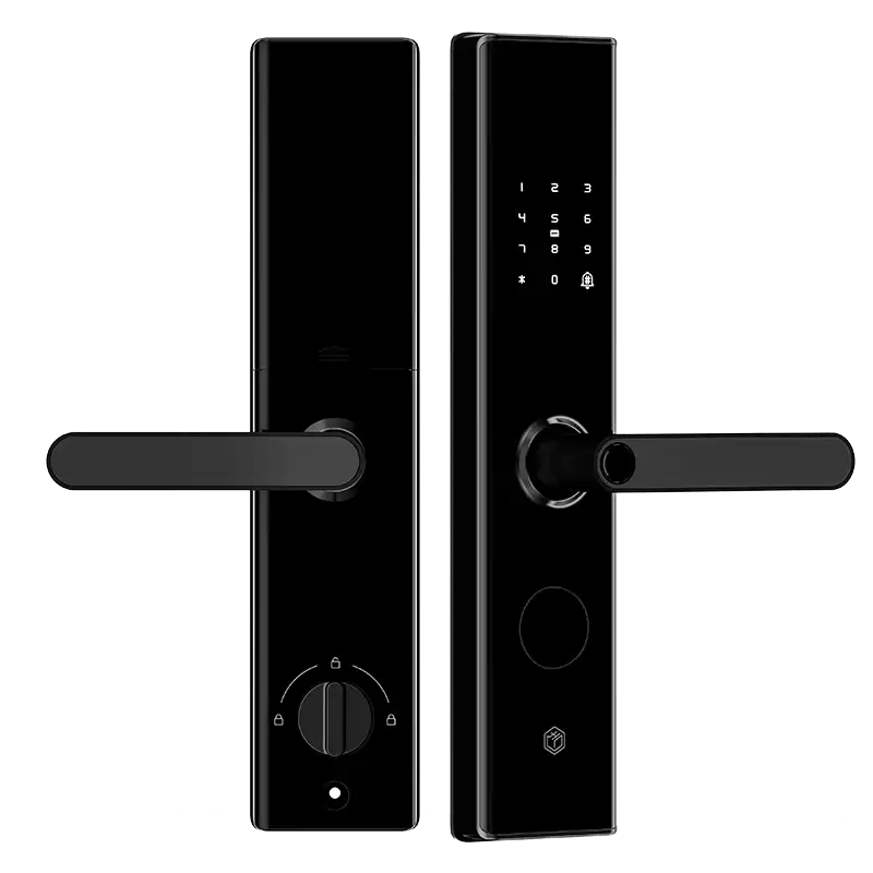 这款门锁造型简约,匹配“四等深微曲面玻璃”黑色面板。内置“AI 自学习指纹技术”,支持指纹 / 密码 / 卡片 / 临时密码 / 钥匙 / 蓝牙 / 双重认证开门方式,同时接入了米家 App(需要搭配具有蓝牙网关功能的设备使用)。