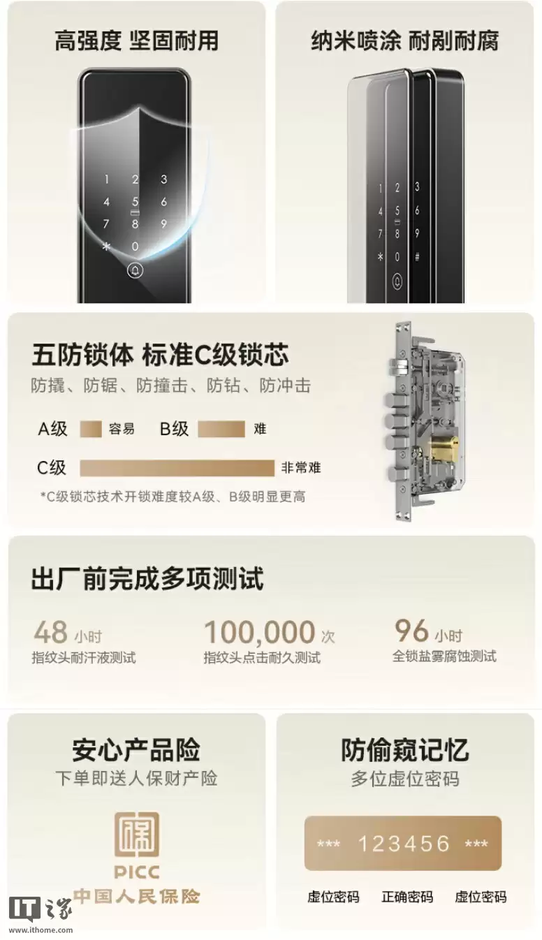 该机采用 8 节干电池供电,支持 USB-C 应急外接移动电源充电,使用直插式 C 级防盗锁芯,附产品参数如下: