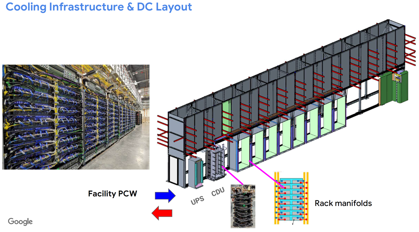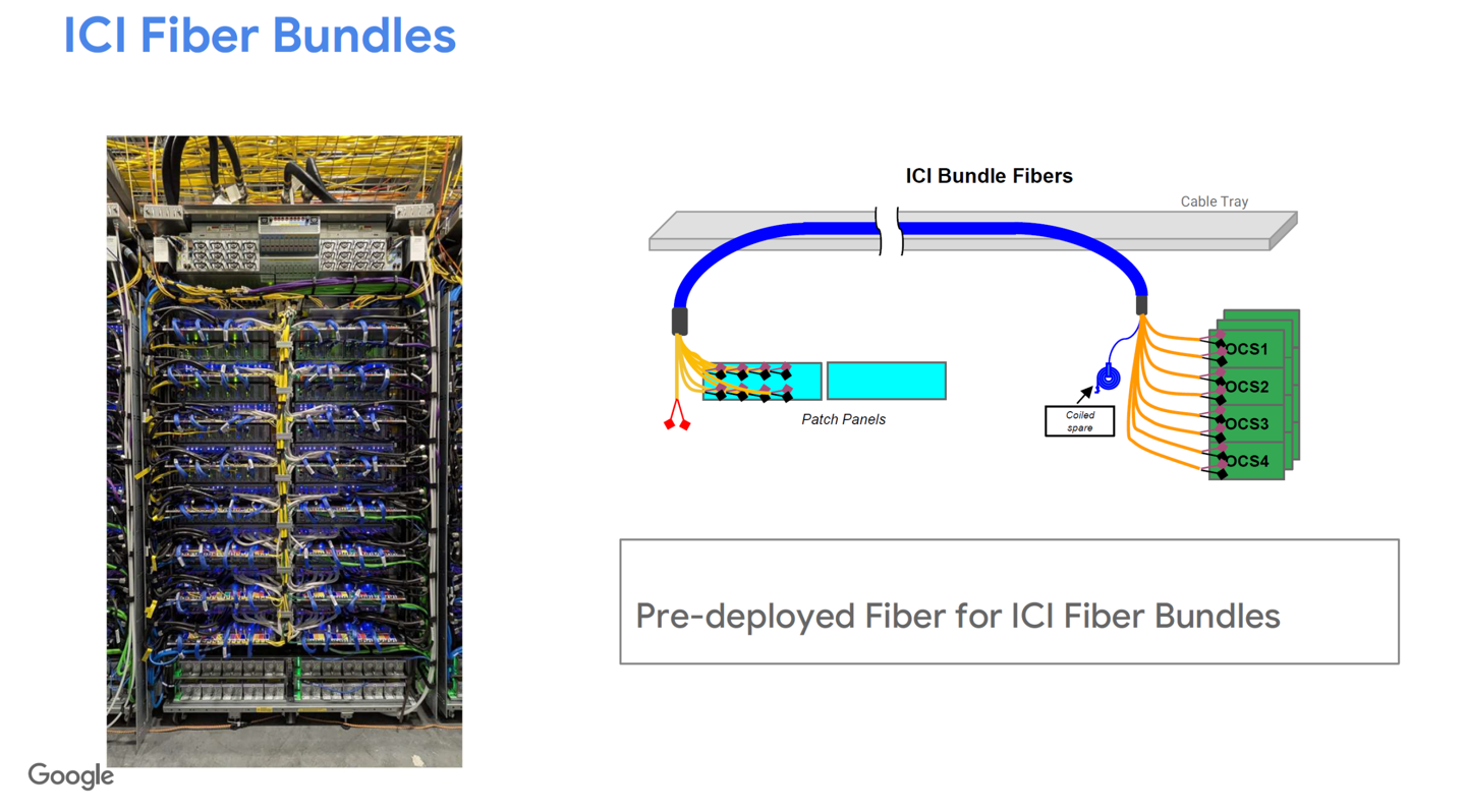 每四颗芯片组成一块 PCBA 主板,16 块主板构成一个机架,共 64 芯片节点,谷歌采用 InterChip Interconnect(ICI)技术,将多达 43 个 64 芯片模块互连,构建出拥有 1.8PB/s 网络带宽的集群。