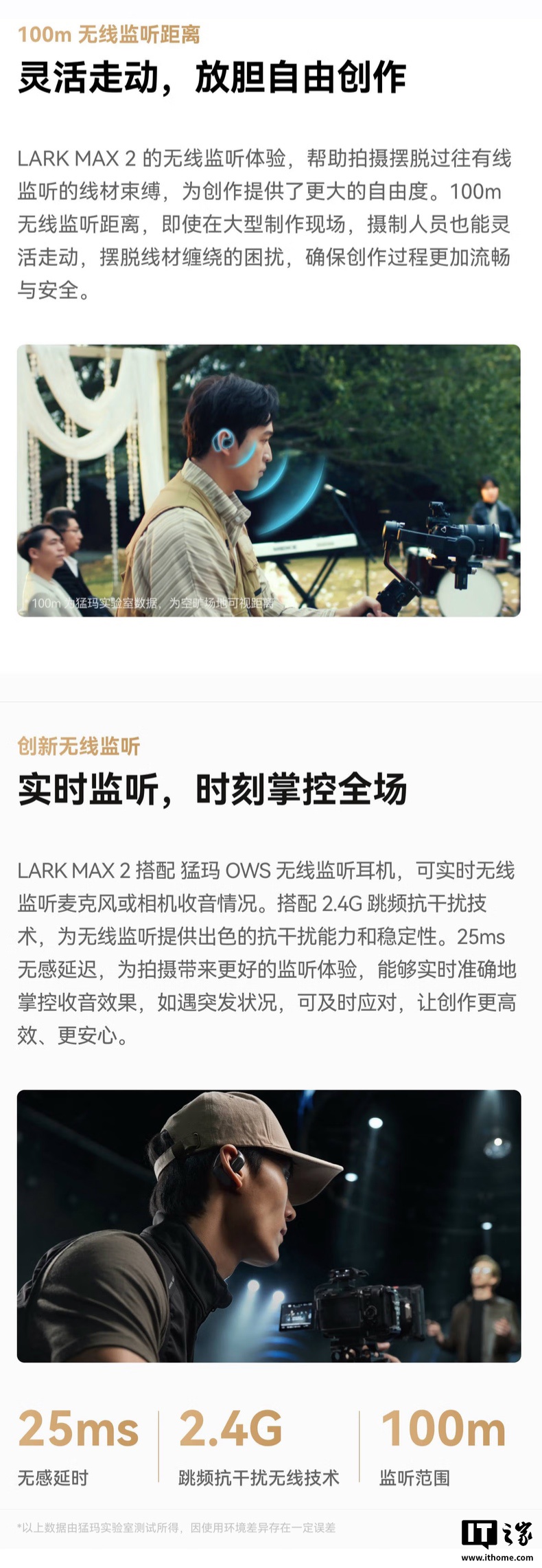 官方强调,该麦克风在搭配 OWS 监听耳机的情况下可以实时无线监测麦克风或相机收音情况,相应耳机采用跑道型单元、开放式设计,续航至高 18 小时。