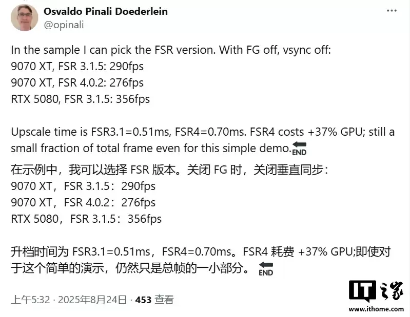 8 月 26 日消息,科技媒体 WccfTech 昨日(8 月 25 日)发布博文,报道称在 Radeon RX 9070 XT 显卡上,AMD 最新 FSR 4 超分技术显著提升画质,但会增加 GPU 负载,导致帧率略降。