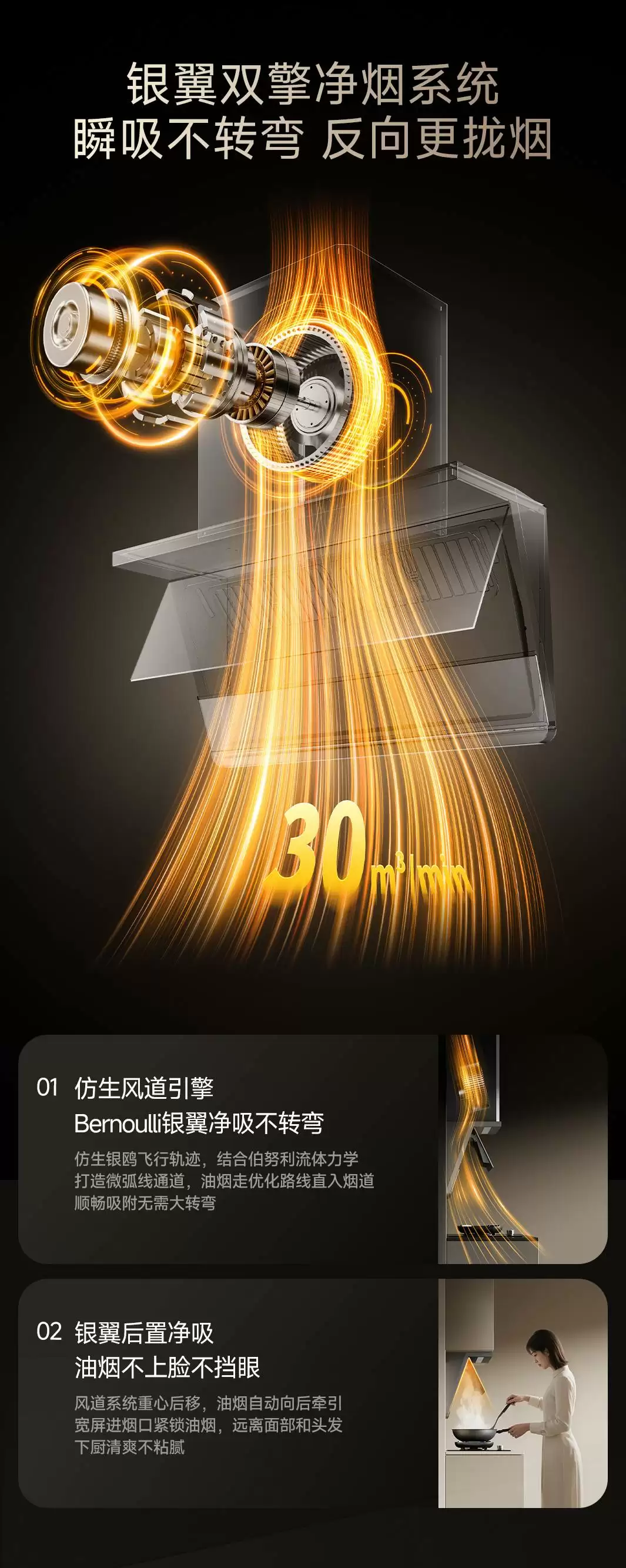 烟机可与灶具联动,点火瞬间烟机自动开启,智能相伴,周到守候下厨时光。30m³/min澎湃风量堪称“吸烟速度最快的油烟机”,瞬吸油烟,双翼拢吸锁住热辣鲜香,时刻维持开放式厨房的环境清新。快速吸也要顺畅排,追觅净烟机搭载1200Pa超强静压及智感巡航增压系统,保证持久排烟,高峰时期开火也能保障公共烟道为我所用,防止倒灌。