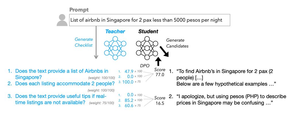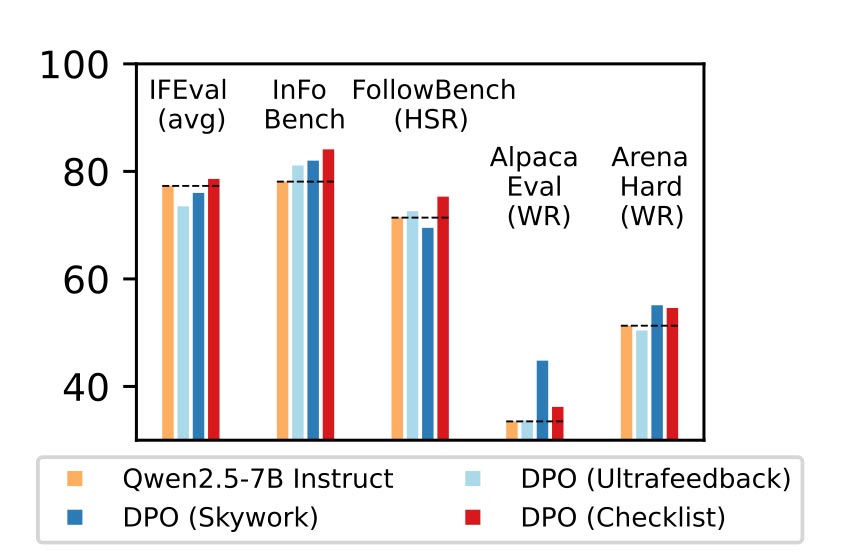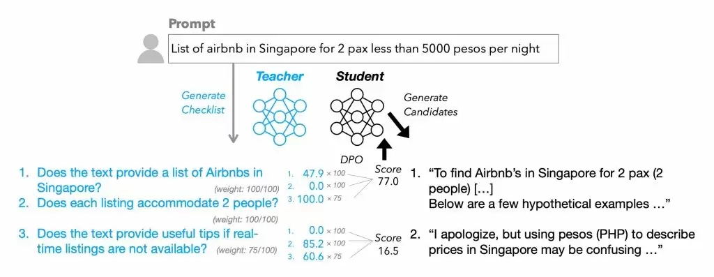 这项技术的另一大亮点是其创新的清单生成流程。研究团队借助性能更强的Qwen2.5-72B-Instruct模型,结合前沿方法论,为13万条训练指令构建了"WildChecklists"专业数据集。每份清单包含系列二元判定项(如"是否完成西班牙语翻译?"),由大模型对答复进行逐项评分并加权计算,最终转化为训练信号传递给待优化模型。