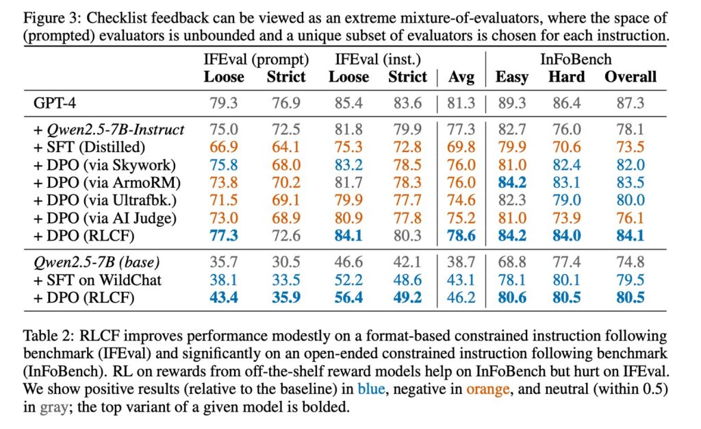 注:RLCF全称Reinforcement Learning from Checklist Feedback,摒弃了传统RLHF(人类反馈强化学习)的粗放评分模式,转而针对每条指令生成包含具体评分细则的检查清单,以0-100分的精细化评估体系驱动模型迭代优化。