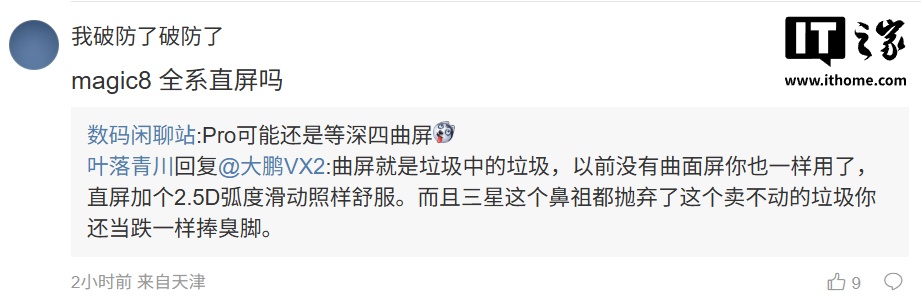 ”;另一名网友则询问道:“Magic8 全系直屏吗”,博主则表示:“Pro 可能还是等深四曲屏