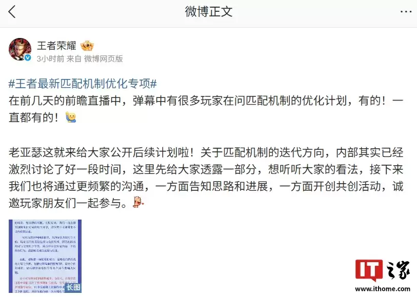 8 月 26 日消息,在前几天腾讯《王者荣耀》S41 赛季前瞻直播中,有玩家询问匹配机制优化计划。游戏官方今日回应称一直都有优化计划,并表示关于匹配机制的迭代方向,内部已激烈讨论了一段时间,接下来将通过更频繁的沟通,一方面告知思路和进展、一方面开创共创活动,邀请玩家一起参与。