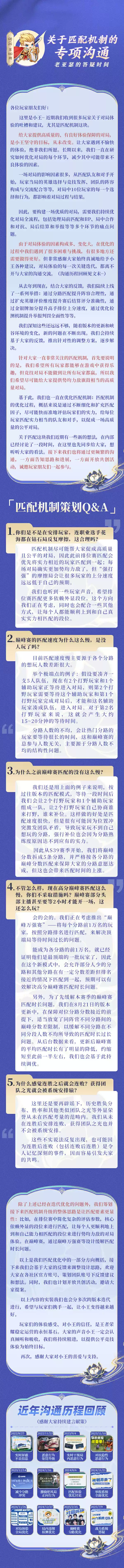 官方表示,《王者荣耀》将不断细化和扩容匹配因子,尽可能快而准的评估玩家实力;持续优化对局全流程,包括处理局前匹配和 BP、局中合作和对抗、局后结算和举报等环节痛点问题;简化复杂评估参数;正考虑排位赛更多依赖外显段位,同时配合一些其他方式,让玩家都能顺利上到自己真实实力匹配的段位。
