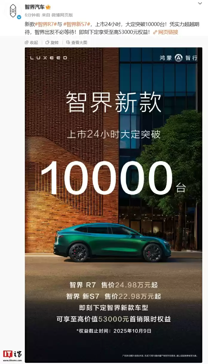 8 月 26 日消息,鸿蒙智行智界汽车官方微博今日宣布,新款智界 R7、新 S7 汽车上市 24 小时大定突破 10000 台,号称“凭实力超越期待”。