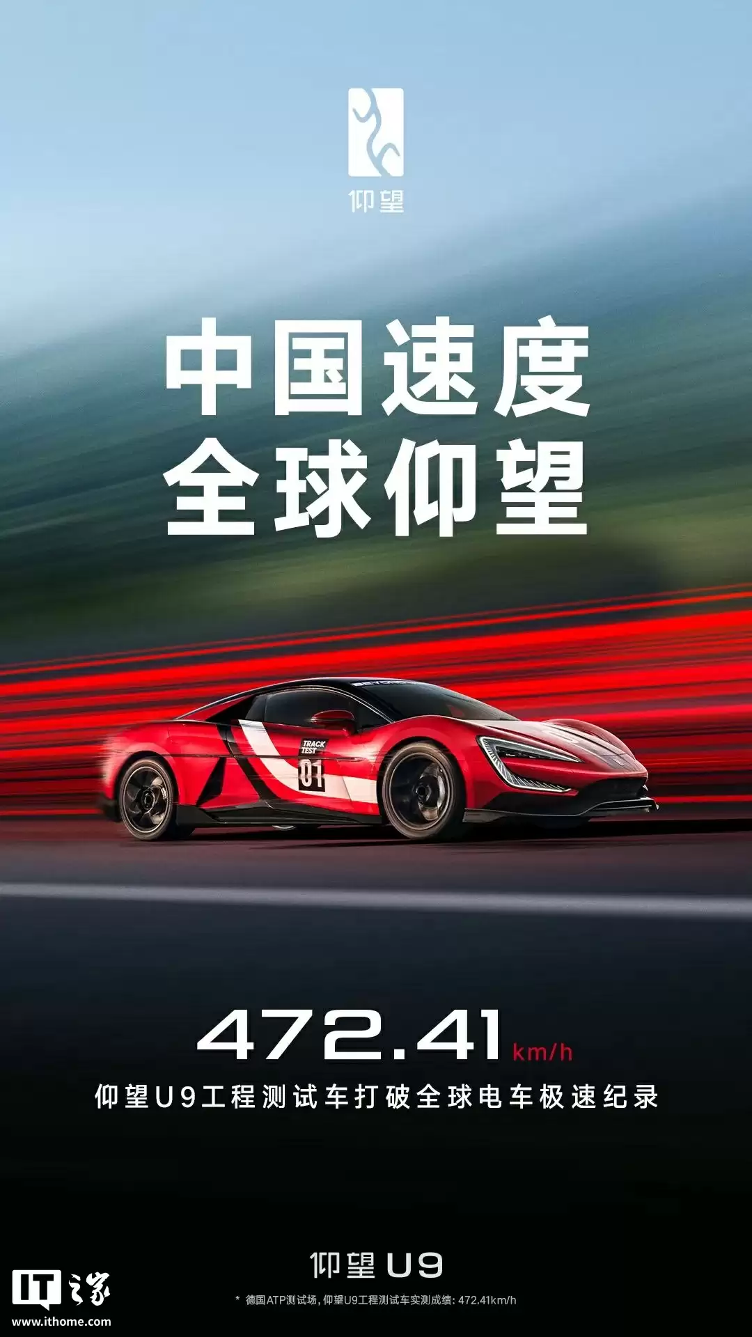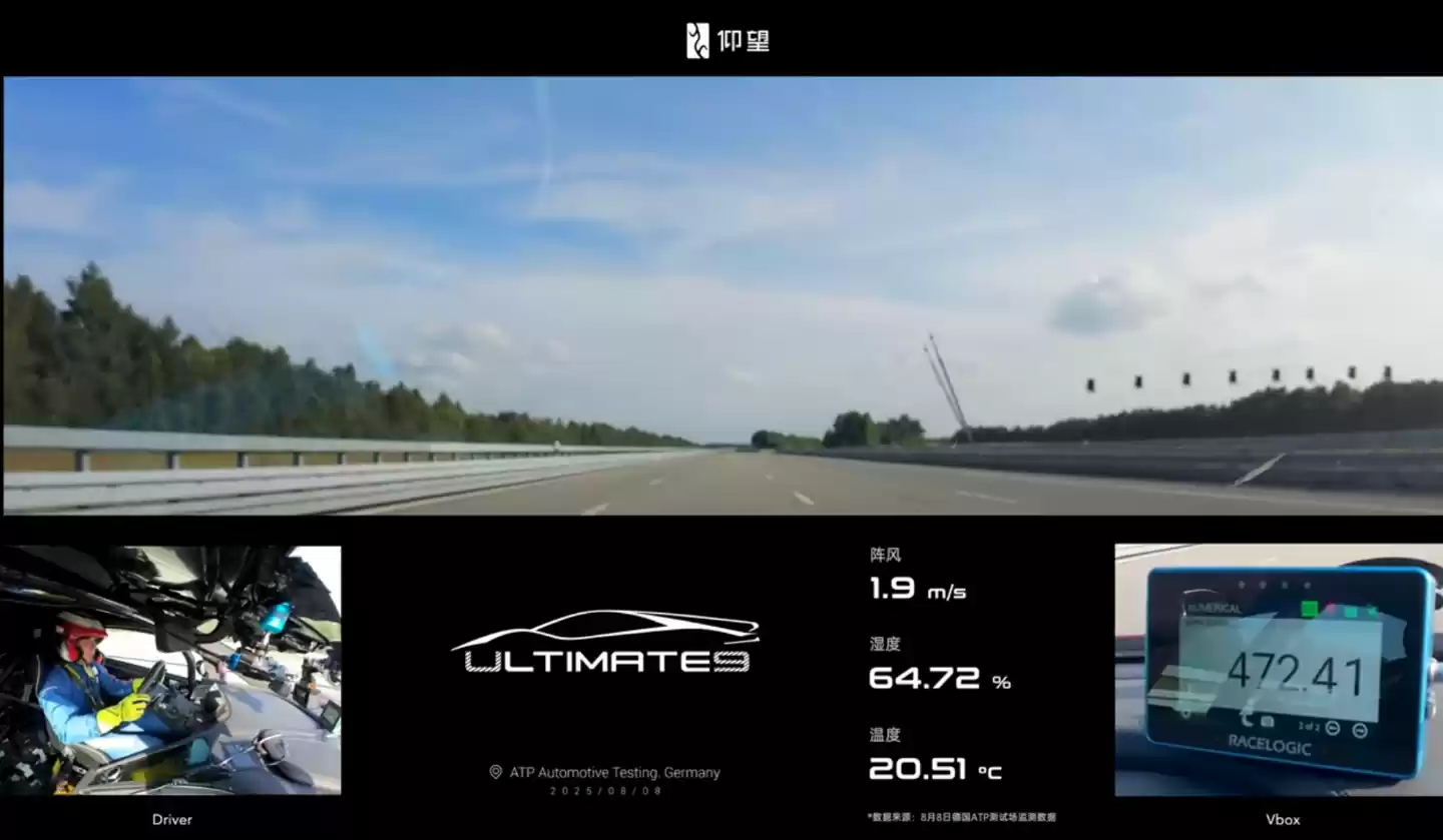 仰望汽车官方现已放出仰望 U9 工程测试车破极速纪录的第一视角车载视频,从视频可以看到,测试车一开始在赛道上通过高速转向暖胎,然后进入了测试环节,最后持续加速至 472.41km/h。