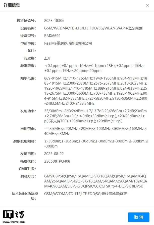 8 月 26 日最新消息,realme 真我 GT8 系列新机已于 8 月 22 日通过工信部无线电核准,设备型号为 RMX6699。