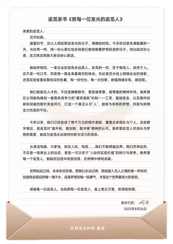 他在信中提到,希望在公司构建一套具有竞争力的“重奖激励”机制,在工资和基础奖金之外,提供创新和突破的额外奖金支持,以此来打造一个真正认可“人”,为所有梦想、热爱和拼搏托底的平台。