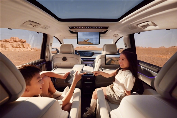 双独立二排座配备320mm超长电动前后滑动调节,新增扶手加热和腿托加热,实现环抱式全域座椅加热,拥有三档可调8点“指压式”增强按摩,同时还新增一键VIP功能,实现头等舱云端模式,可与副驾座椅联动。