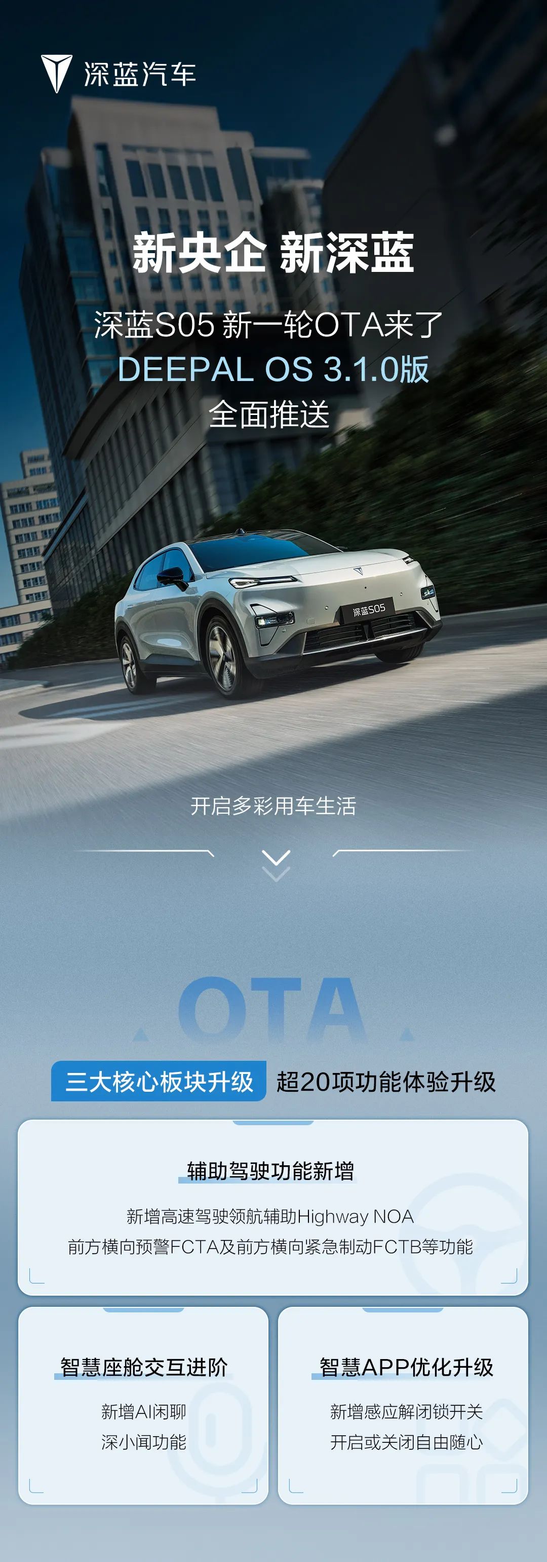 据8月26日消息,深蓝汽车今日正式推送新一轮OTA升级服务,旗下深蓝S05车型将获得DEEPAL OS 3.1.0版本更新。此次升级主要增强了智能驾驶辅助系统,引入了多项安全防护新功能。