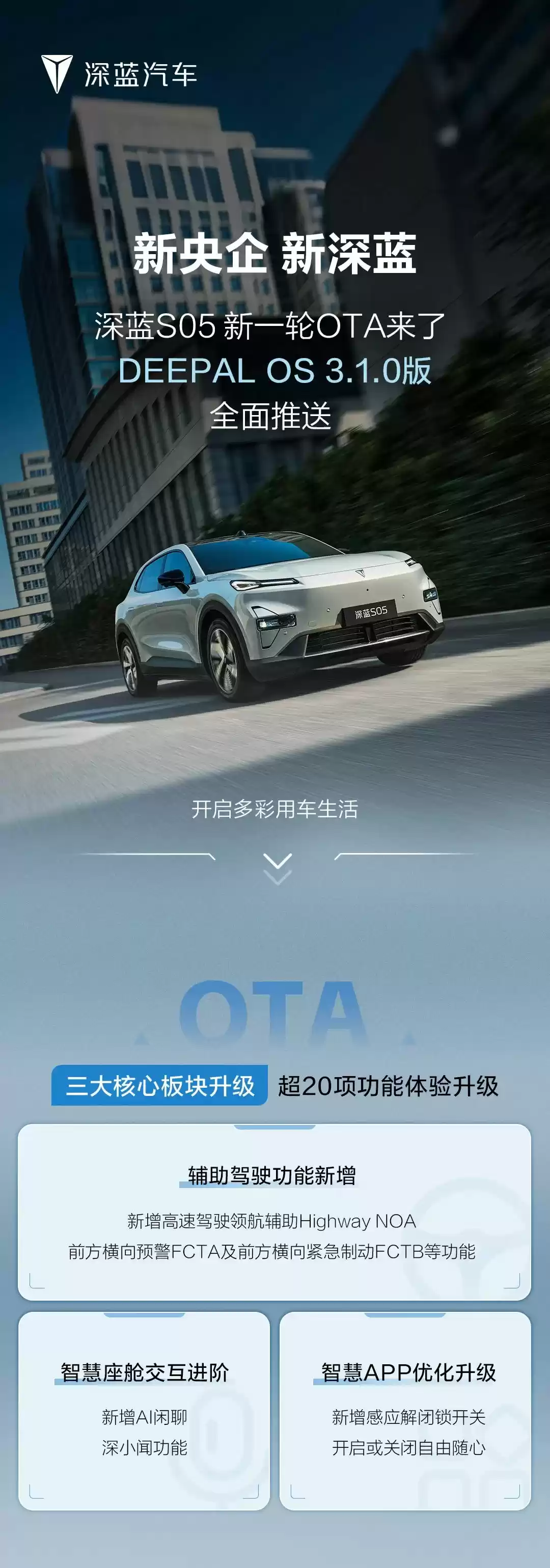 深蓝S05推送DEEPAL OS 3.1.0:新增高速NOA驾驶辅助系统