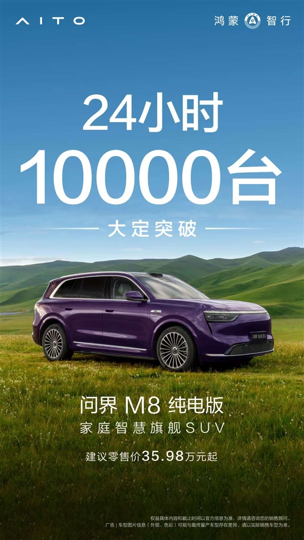 问界M8纯电版上市24小时订单破万,35.98万起售实现油电同价