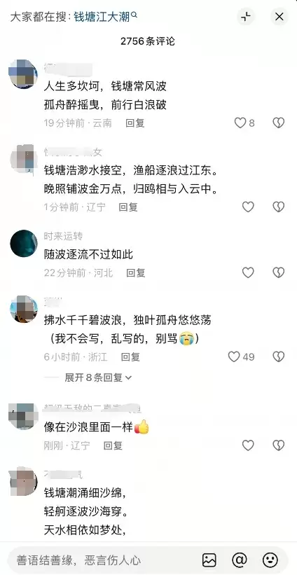 有网友写道:人生多坎坷,钱塘常风波,孤舟醉摇曳,前行白浪破。