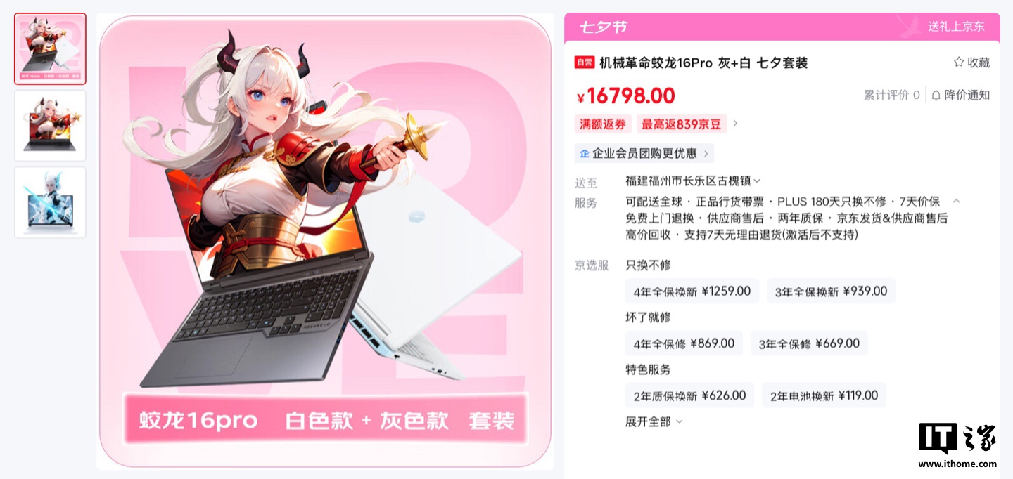 8 月 26 日消息,机械革命现已在京东上架一款“七夕套装”,主要包含两台蛟龙 16 Pro 笔记本,商品卡标价为 16798 元。