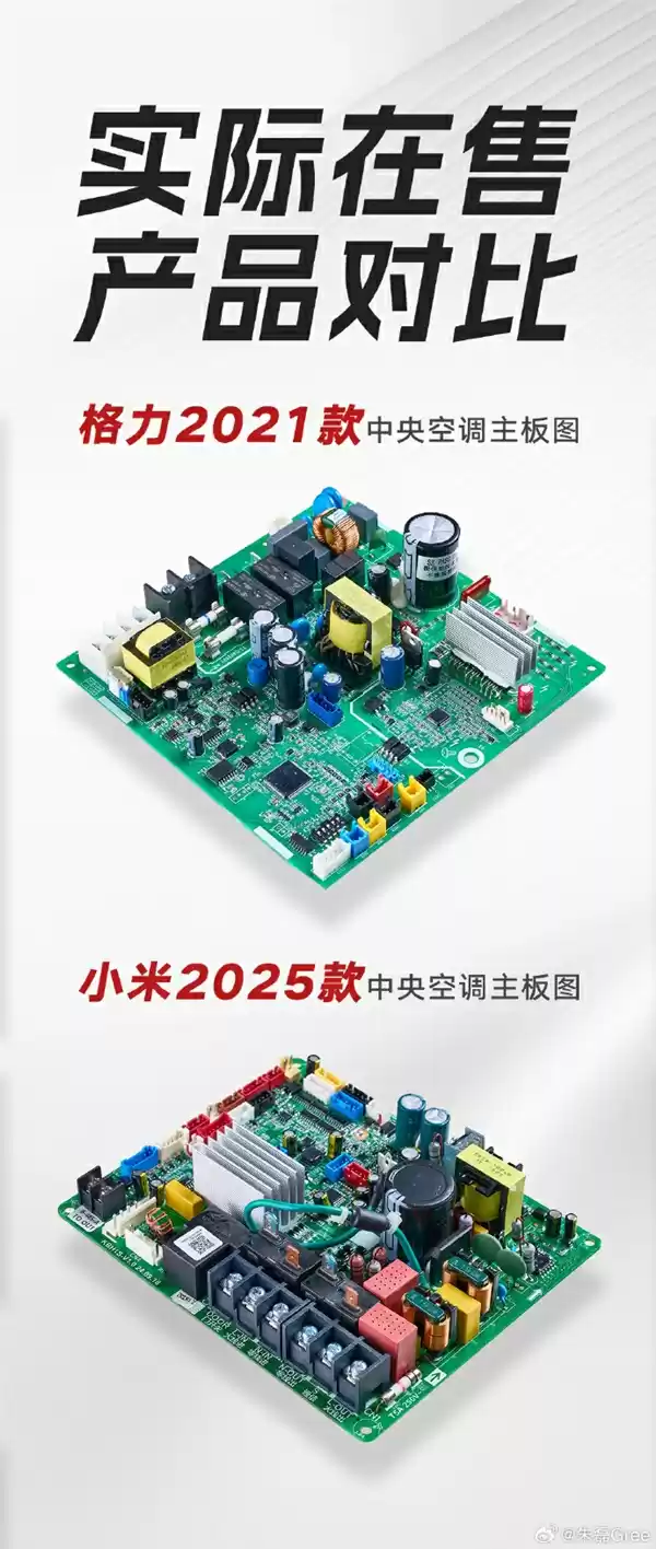 此外,在卢伟冰转发的一张所谓“小米中央空调”和“格力中央空调”的主板结构对比图显示,这是一张拉踩明显且经恶意处理的图片,却被广泛传播,刻意引导“格力做工粗糙”的印象。