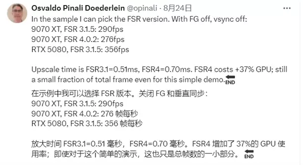 @opinali通过使用AMD FFX SDK 2.0版本,对AMD Radeon RX 9070 XT显卡进行了FSR 4的测试。
