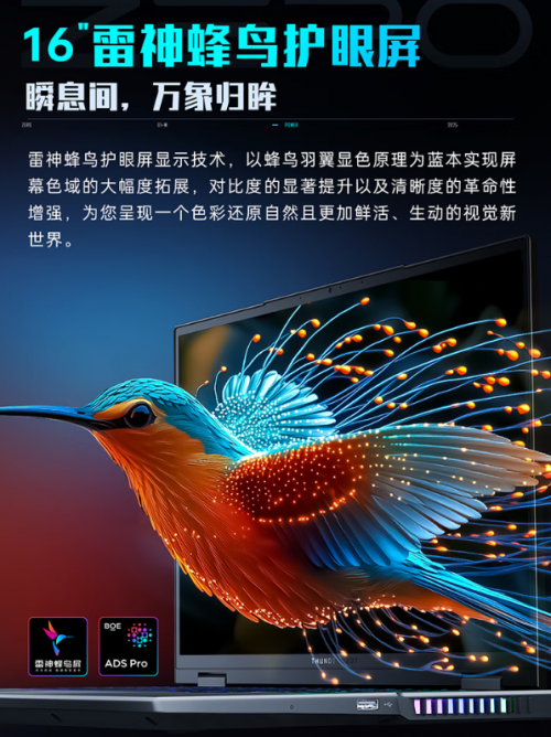 雷神 ZERO 16 Pro 配备 16 英寸雷神蜂鸟护眼屏,拥有 100% DCI - P3 广色域、600nit 高亮度,更支持 360Hz 超高刷新率及 2.5K 超高分辨率。