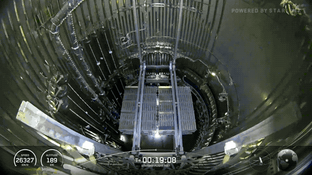 进入二级飞行阶段后,星舰持续上升,并首次成功释放 8 颗星链模拟卫星,整个部署过程大约每分钟释放一颗,有序完成全部部署。