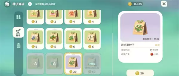 每袋饱饱果种子售价20金币,平均可收获10个饱饱果(未经祝福状态下的实际产出率在1.06~1.18之间)。