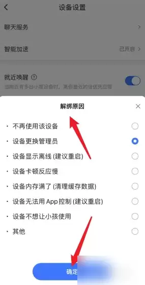3、在解绑确认界面,根据实际情况选择解绑原因,最后点击【确定】完成操作。