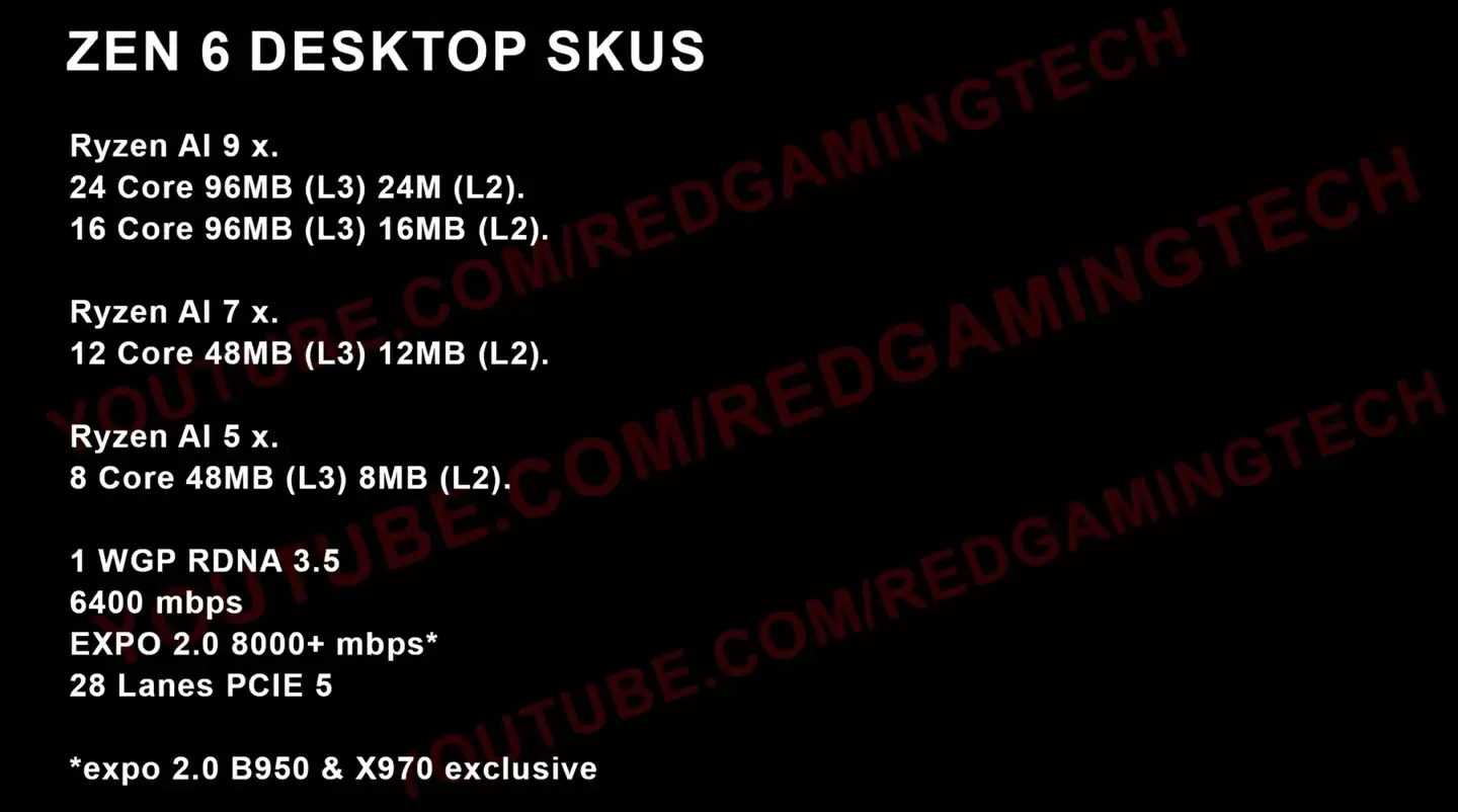 8 月 27 日消息,Youtube 频道 Red Gaming Tech 在最新一期视频中,透露 AMD 计划于 2026 年推出 Zen 6 架构 Ryzen 处理器,泄露信息显示将采用“Ryzen AI”命名,并在 Ryzen 5/7/9 系列中提升核心数量,最高可达 24 核。