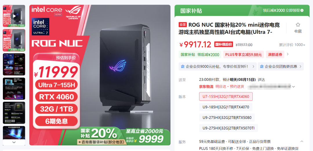 ROG NUC 全线产品参加「国家补贴20%」,国补后价格从9999-12499-16999-22999,有电商会员价格还能更低,丰俭由己,快来Pick你的玩家国度入场券。