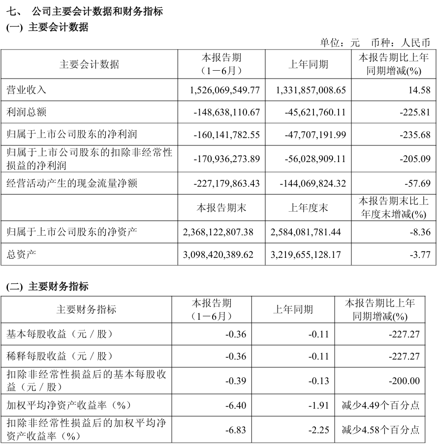 归属于上市公司股东的净亏损 1.6 亿元,上年同期亏损 4770.72 万元;