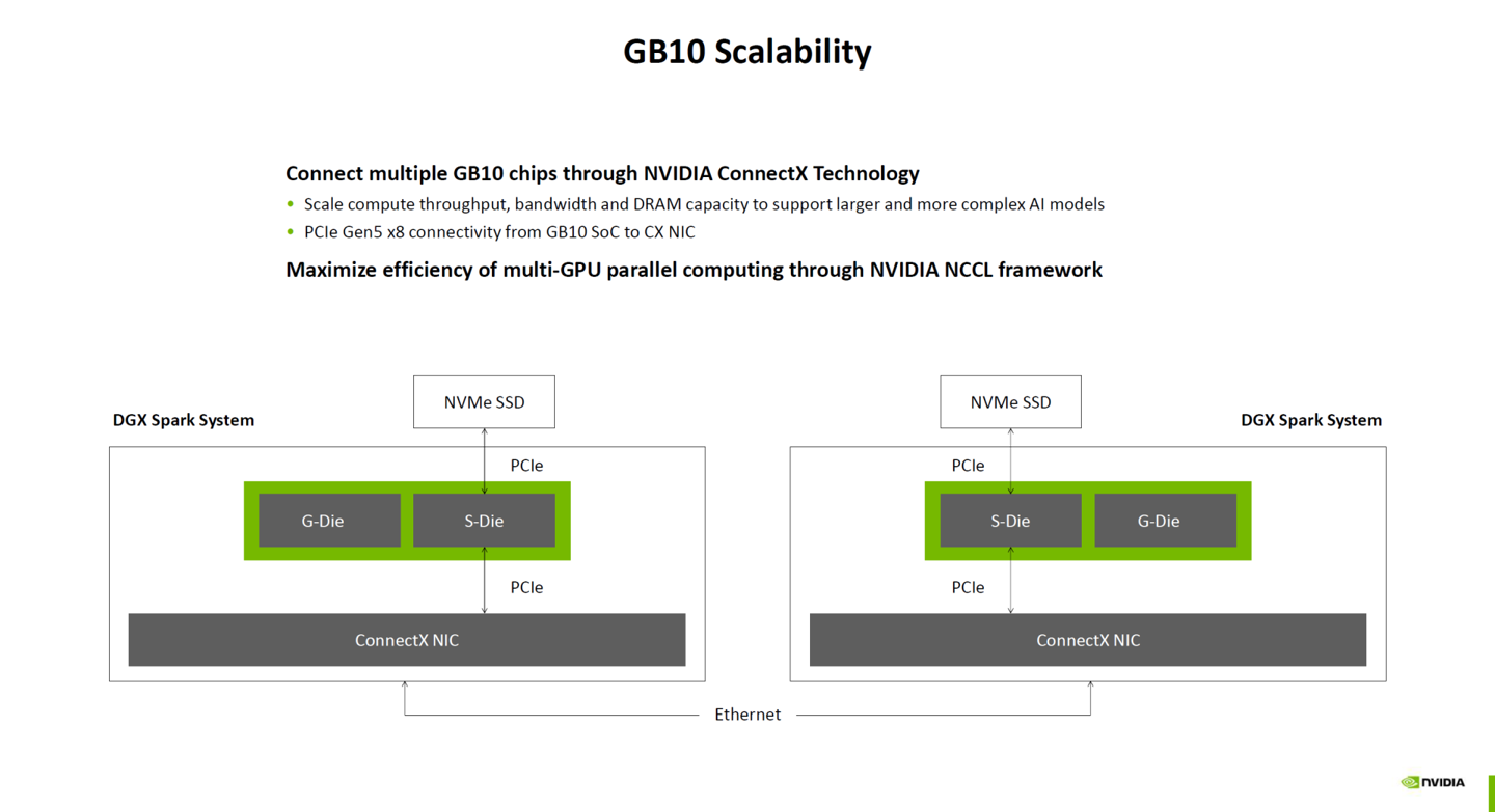在网络扩展上,GB10 可通过 ConnectX-7 网络连接多台 DGX Spark,支持最大 4050 亿参数模型训练。安全特性包括双安全根、SROOT / OSROOT 处理器,以及 fTPM 与独立 TPM 支持,整颗芯片 TDP 为 140W,适合标准桌面供电。
