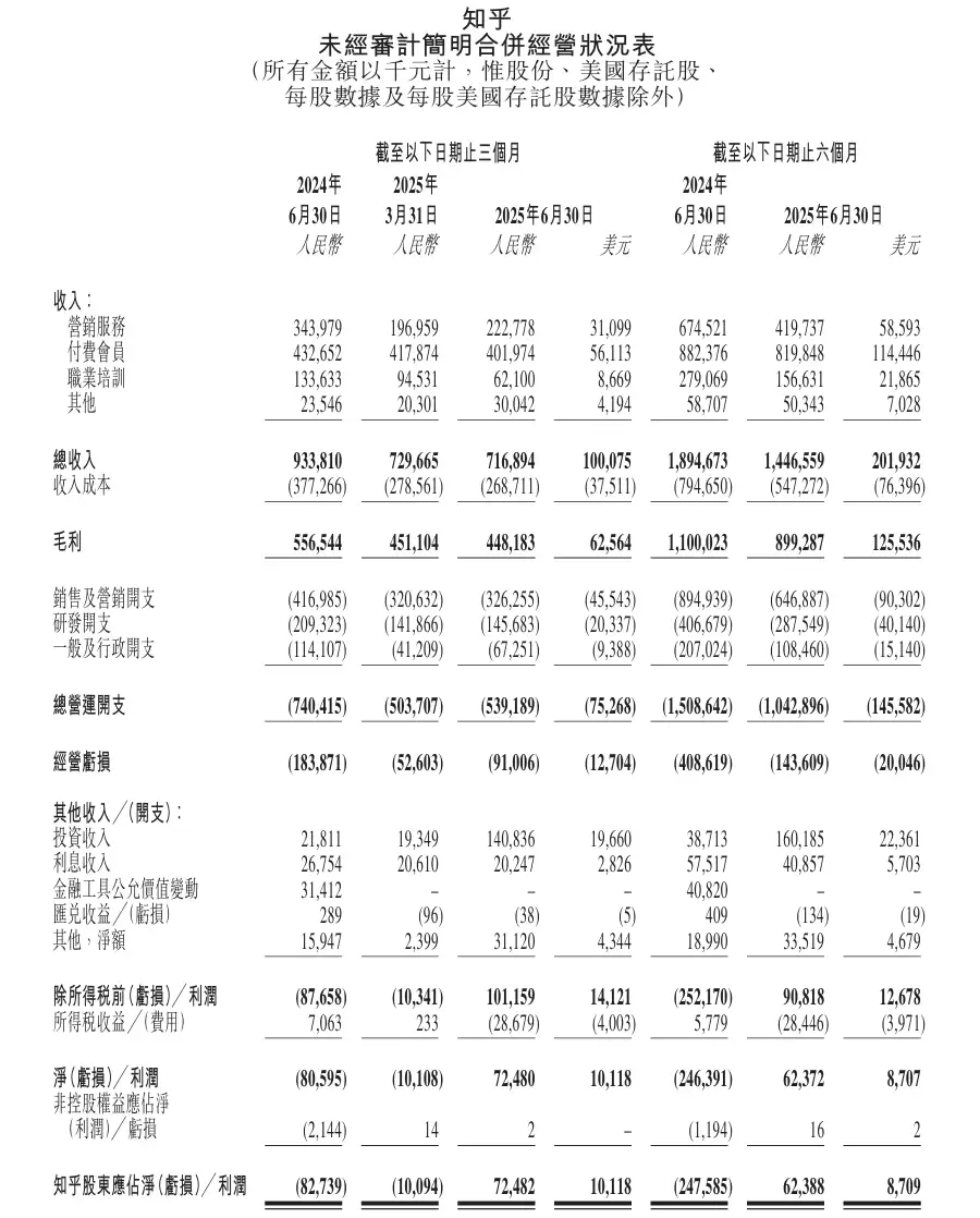- 营销服务收入为2.228亿元人民币,去年同期为3.44亿元。下降主要源于知乎将提升利润率作为战略重点,持续优化服务产品结构