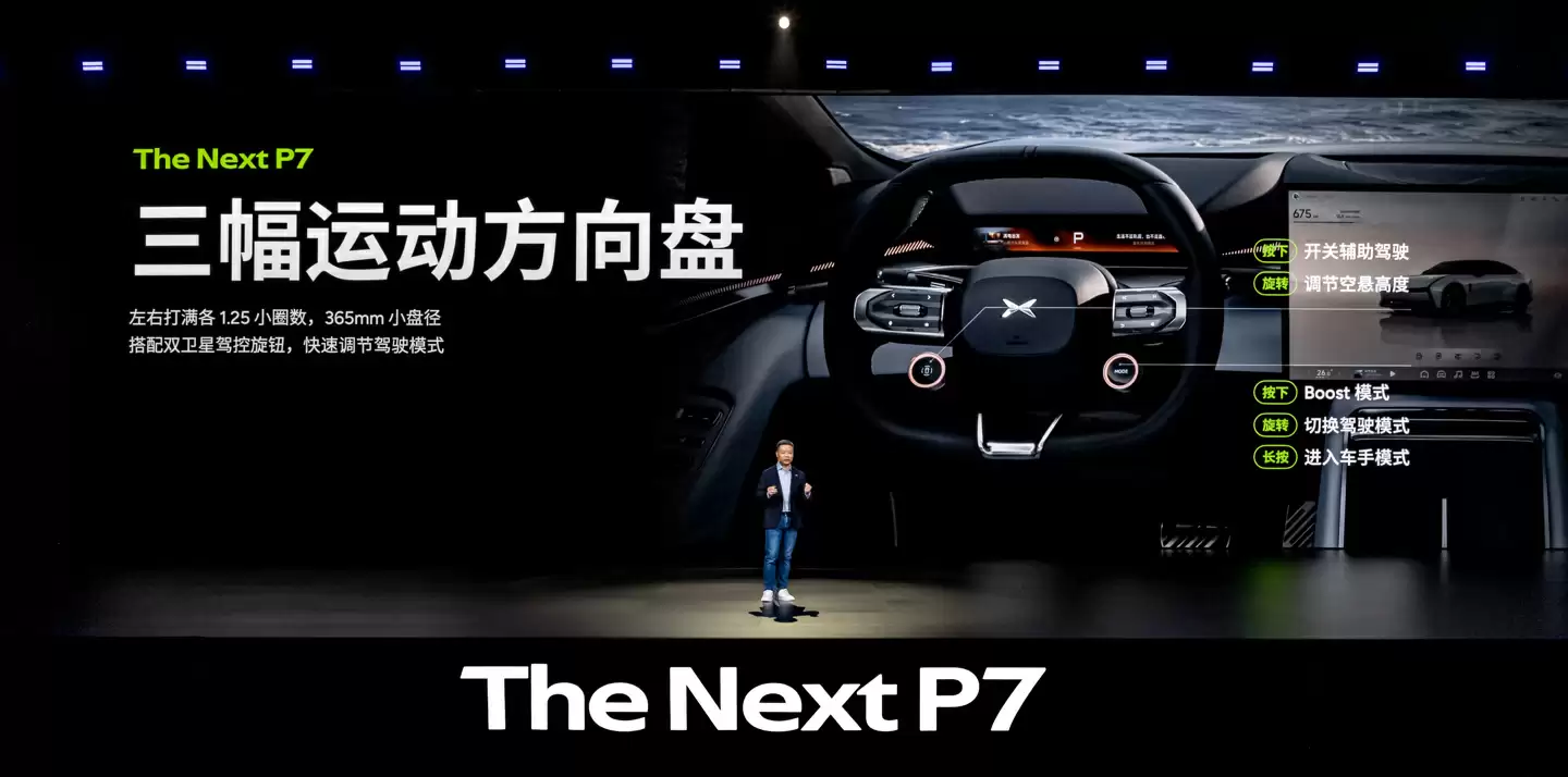 全新小鹏 P7 采用了“智能灵动仿生座舱”,配备行业最大 87 英寸 AR-HUD,支持「追光全景」抬头显示,拥有 365mm 小盘径运动方向盘 + 豪华跑车同款卫星驾控旋钮 + 行业首创车内智驾小蓝灯,还配备了三轴灵动屏、沉浸式运动仪表以及 Touch Pad 智能触控。