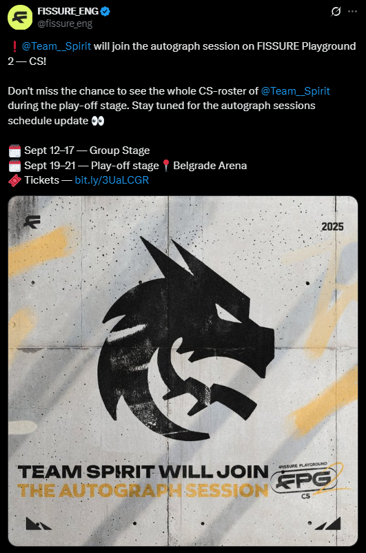 赛事官方的神秘推文写道:"FISSURE团队正在准备特别惊喜...更多细节将于明日揭晓。"而就在几小时前,组委会正式揭晓了谜底:Spirit战队确认将出席FISSURE裂变天地S2赛事的线下签名会活动。