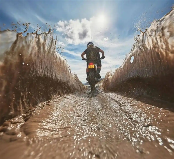 该照片拍摄于英国威尔士,展现的是一位自行车运动员高速驶过水面,轮胎完美激起一片水花。