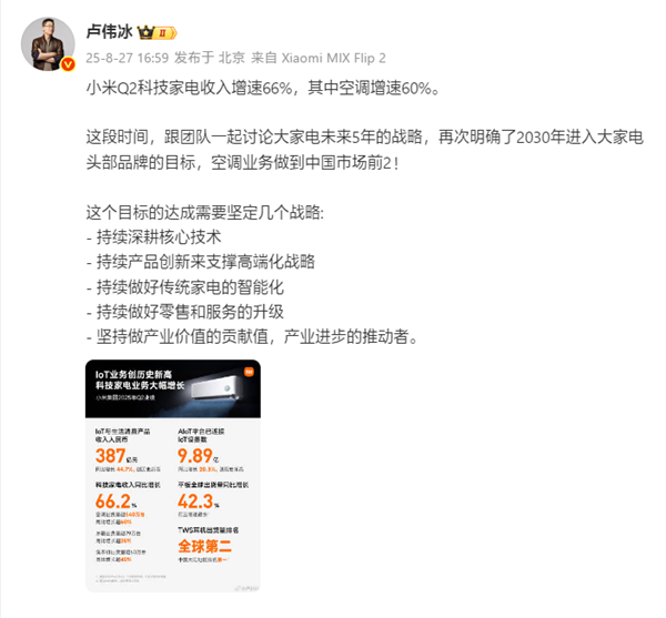小米空调Q2增长60%,卢伟冰:2030年目标中国市场前二