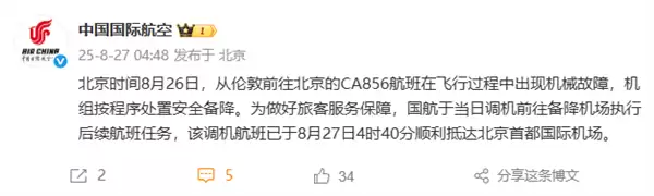 27日上午,国航发布情况通报称,该航班因机械故障备降俄罗斯,调机航班已于27日4时40分顺利抵达北京首都国际机场。